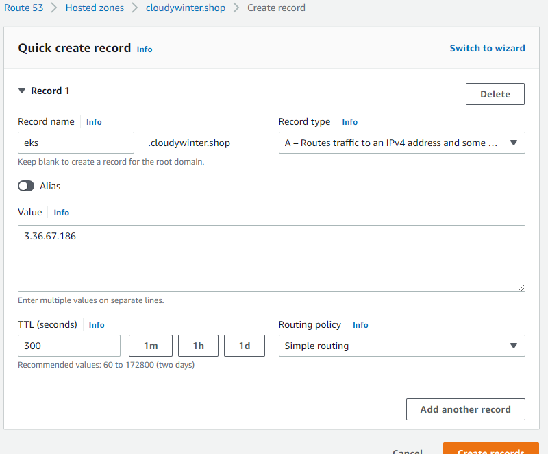 Route53에서 레코드 추가해준다.
