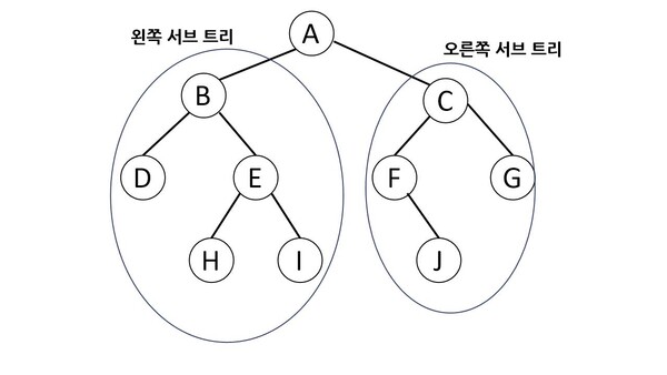 - 루트 노드를 중심으로 두 개의 서브트리로 나뉘어진다.