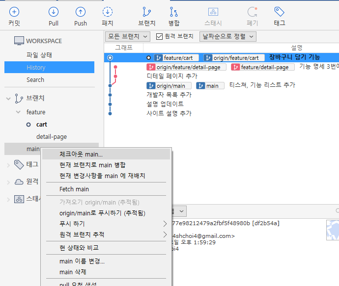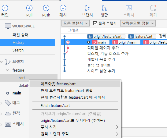 브랜치를 더블클릭하거나, 브랜치 이름을 마우스 오른쪽 버튼으로 클릭하고 [체크아웃]을 선택한다.