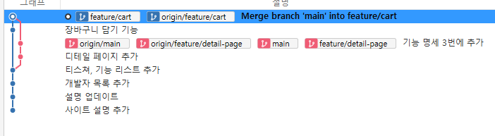 feature/cart 브랜치의 ‘장바구니 담기 기능’ 커밋과 main 브랜치의 ‘기능 명세 3번에 추가’ 커밋이 합쳐진 병합 커밋이 생성되어 feature/cart 브랜치에 올라와 있다.