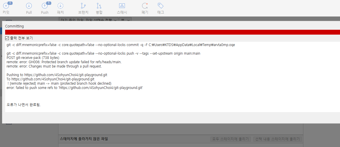 main 브랜치에 직접 커밋을 만들고 push 하면 에러가 난다.