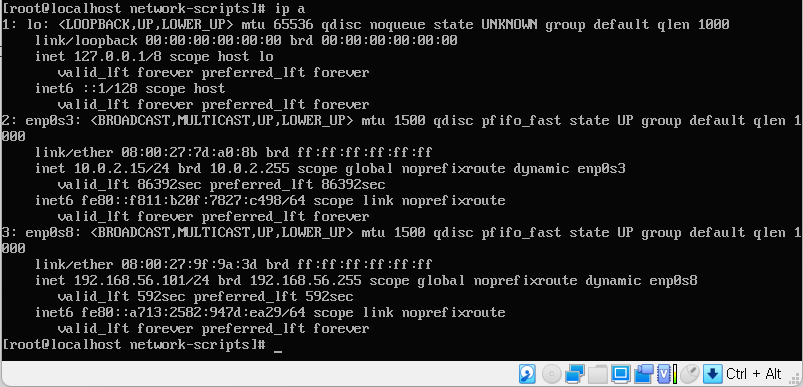 enp0s3, enp0s8 두 개가 나타나며, 하단의 enp08s 에 IP가 나타나지 나타나지 않는 것을 볼 수 있다.