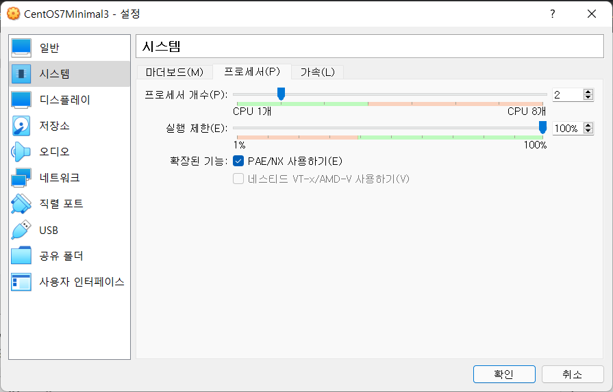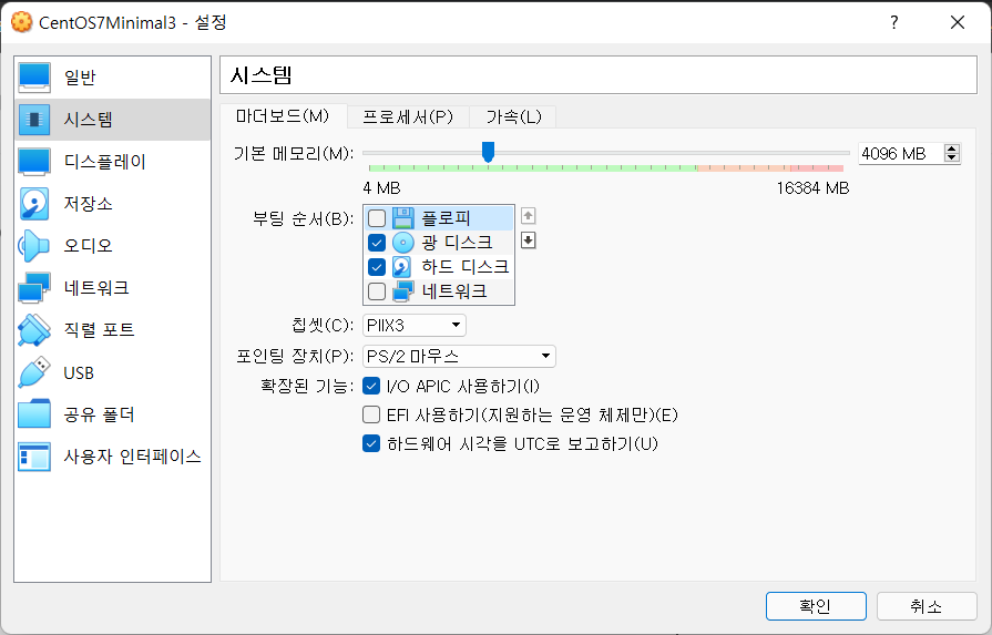 [시스템] 에서 기본 메모리를 4096MB으로 수정, 부팅 순서에서 플로피를 체크 해제했다.