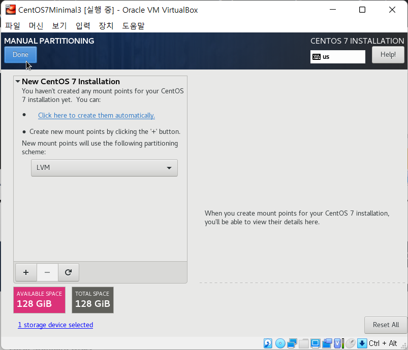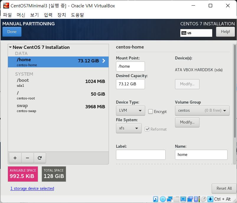 다른 건 다 디폴트값이고, 가상 하드 디스크 크기를 128GB로 설정했다.