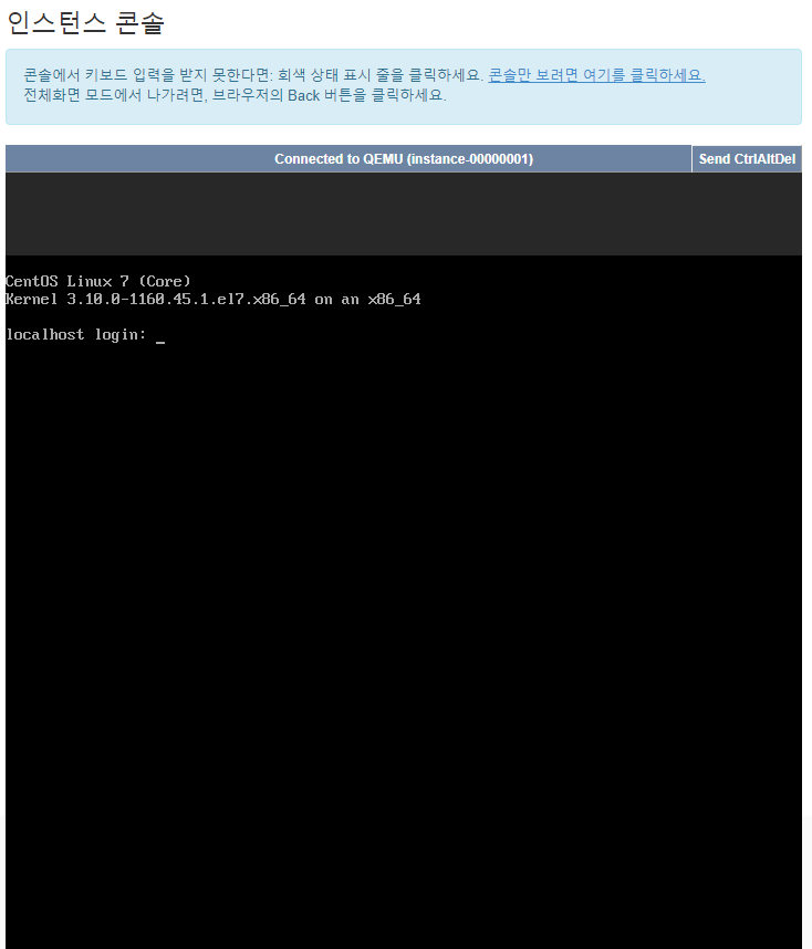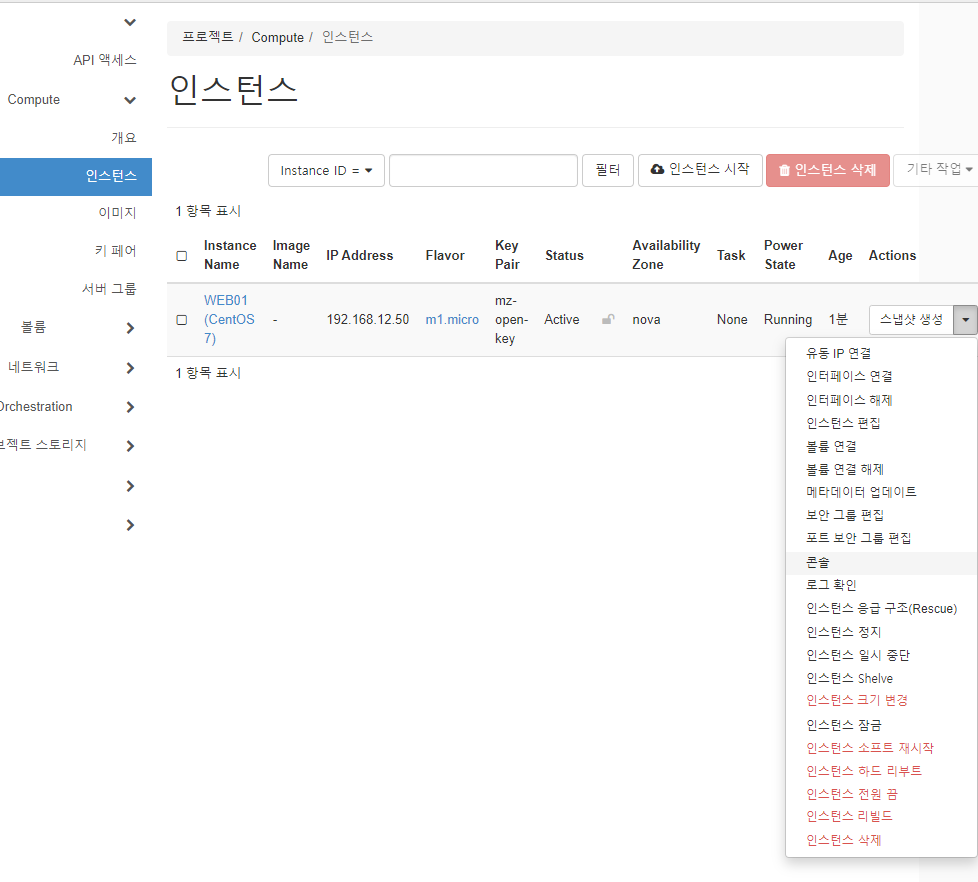 목록에서 생긴 WEB01(CentOS7)의 우측에 드롭다운 버튼을 눌러 [콘솔]을 클릭한다.