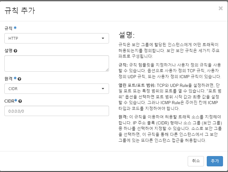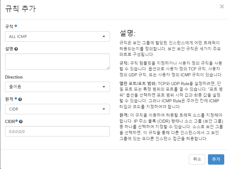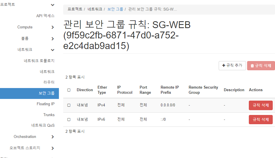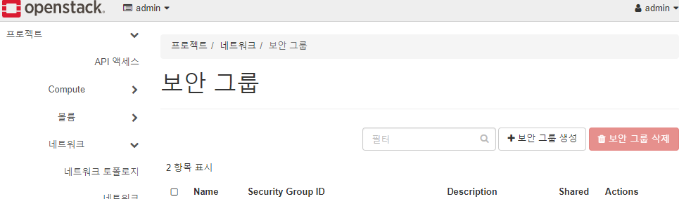 프로젝트 > 네트워크 > 보안 그룹 으로 간다.