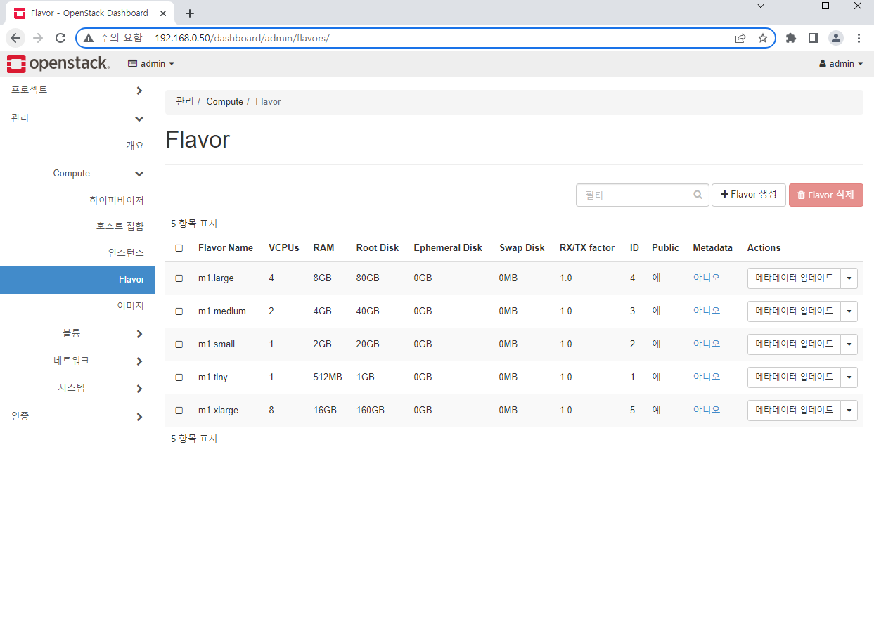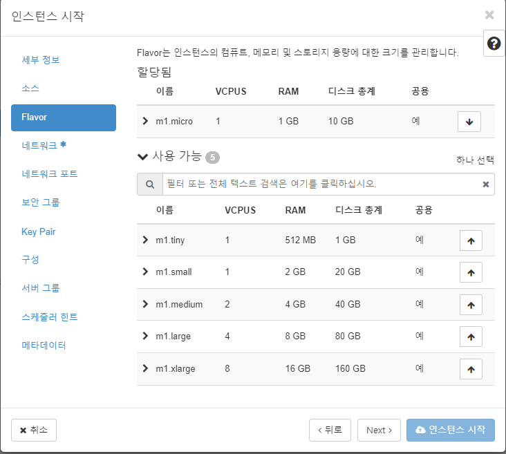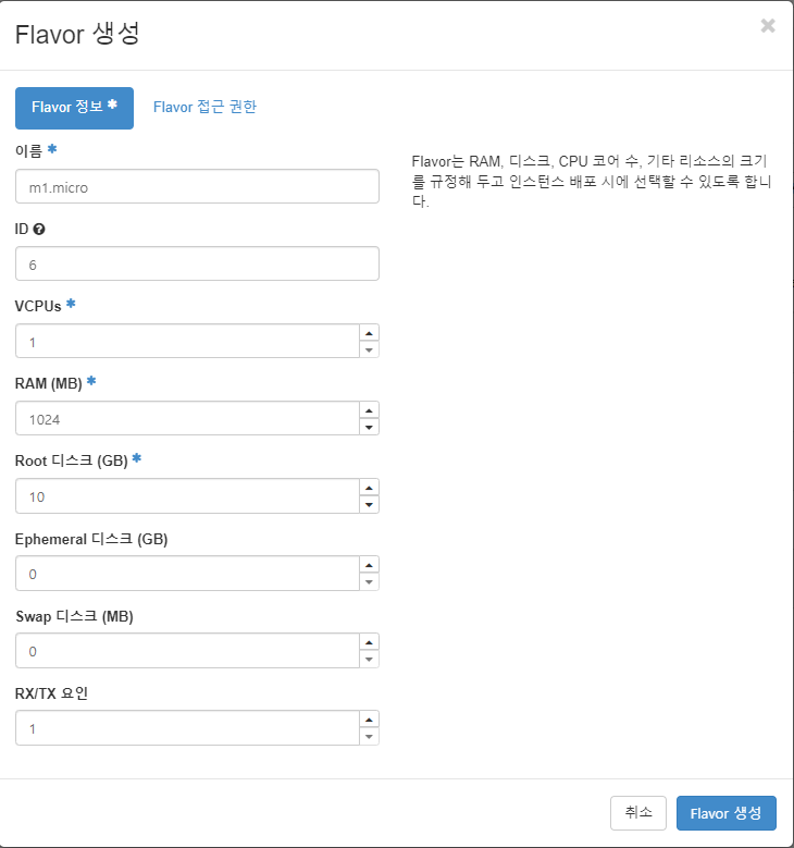 * Flavor : instace를 만들 때 사전에 spec을 정하는 것