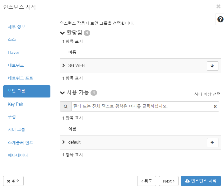 네트워크 포트는 패스, default를 내리고 SG-WEB을 할당한다.