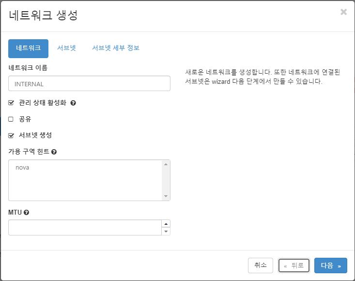프로젝트>네트워크>네트워크 로 들어간 뒤 +네트워크 생성 버튼을 누른다.