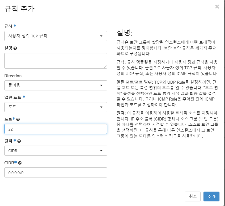 22번 TCP 포트도 추가한다. ( = SSH)