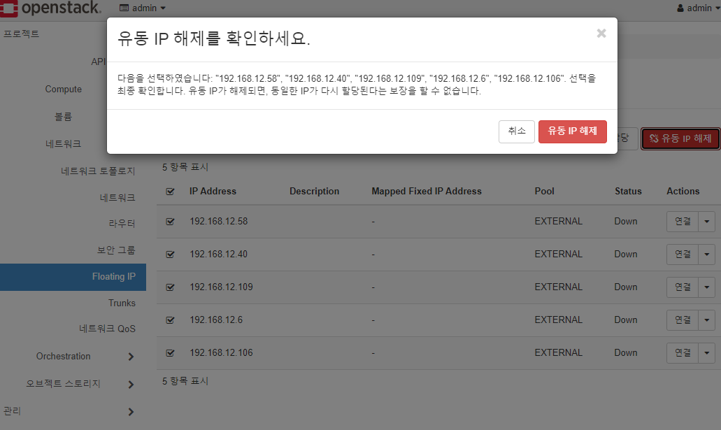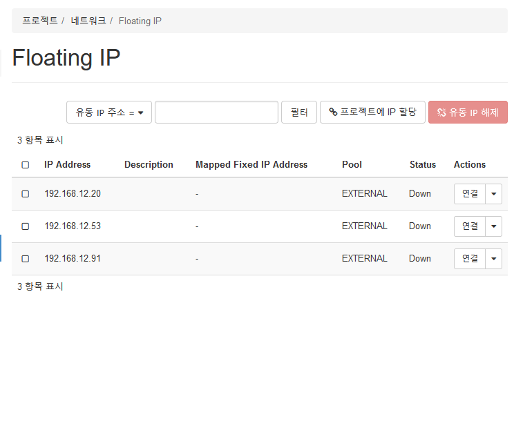 [프로젝트에 IP 할당]을 세 번 눌러 floating IP 3개를 생성한다