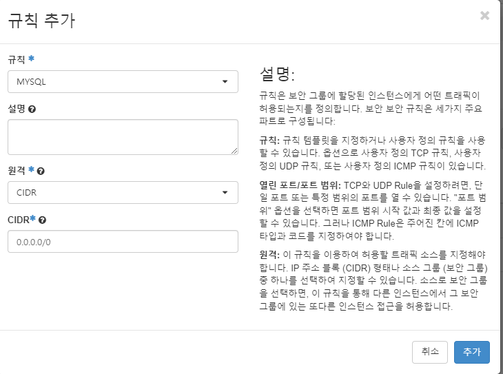 [규칙 추가]를 눌러 SSH, MYSQL, ALL ICMAP를 추가한다.