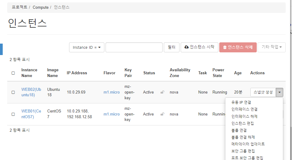 두 개 다 체크표시 한 뒤 기타작업>인스턴스 시작 을 누른다.