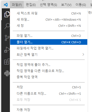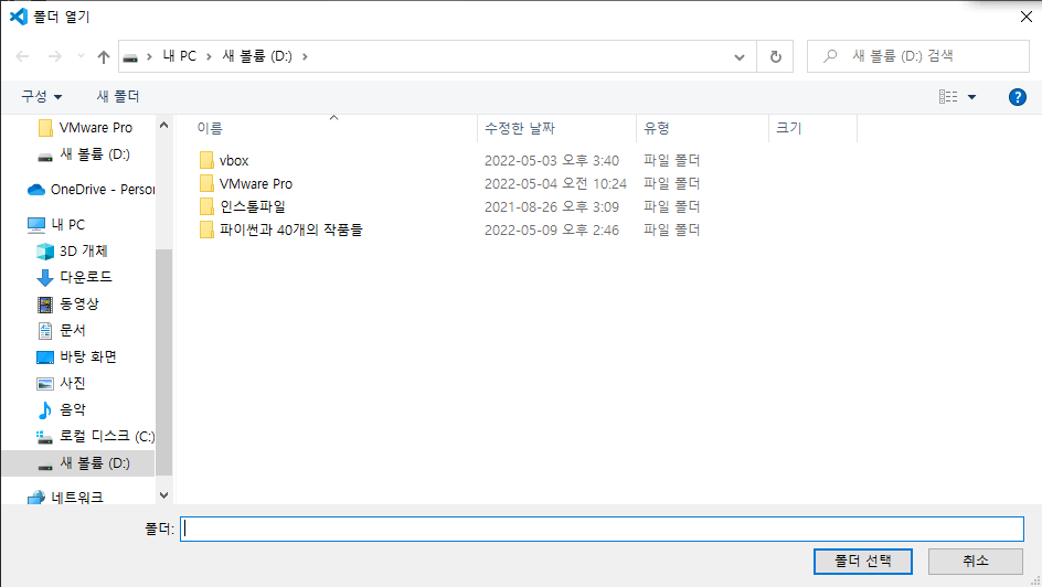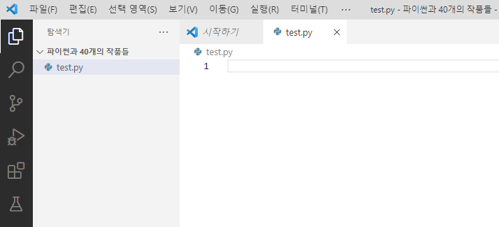 [파일] > [폴더 열기] 를 클릭하여 [D드라이브] > [파이썬과 40개의 작품들] 폴더를 생성한 뒤 추가한다.