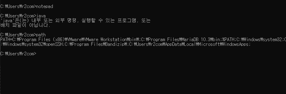 notepad를 치면 메모장이 나오는 것과 달리, java를 입력했을 때는 아무것도 나오지 않는다.
