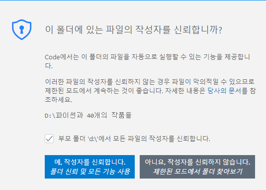 왼쪽의 신뢰 버튼을 누른다. ([모든 파일의 작성자를 신뢰]에 체크할 필요는 없다)