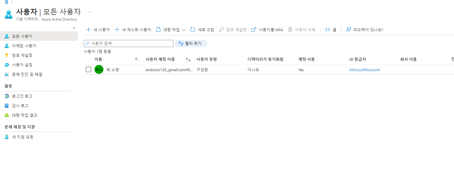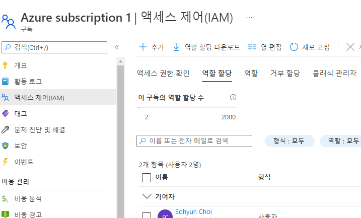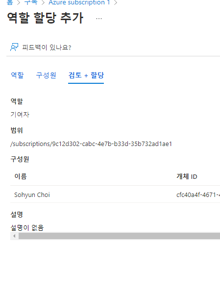 기여자 클릭 -> 다음 페이지에서 [구성원 선택] 클릭 - 좀전에 만든 사용자 추가