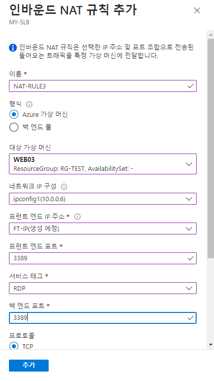 하단의 [인바운드 NAT 규칙 추가]를 클릭한다.