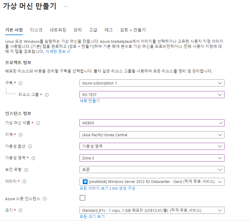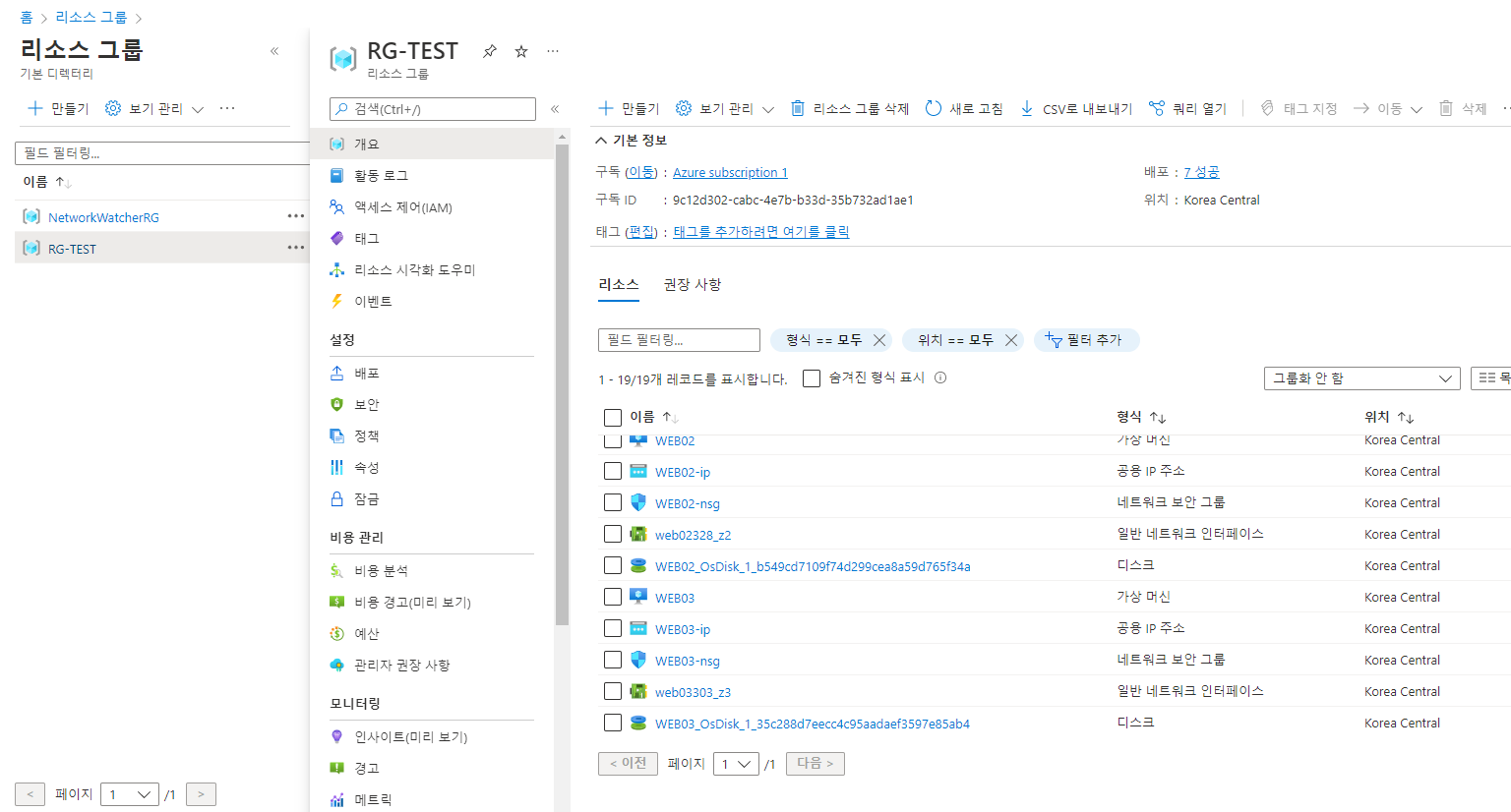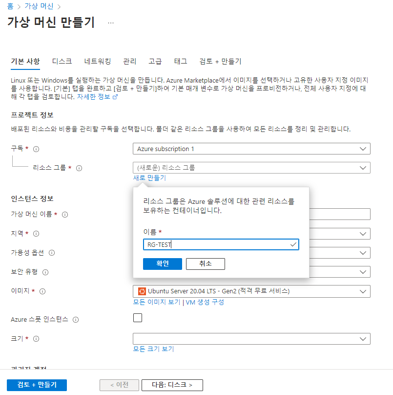 리소스 그룹 - 새로 만들기 클릭해서 RG-TEST라는 리소스 그룹을 만든다.