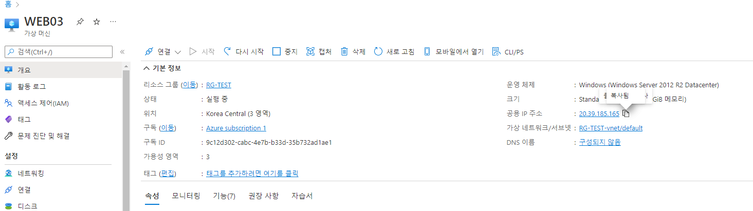 Install이 완료되면, Azure Portal로 들어간 뒤, 공용 IP 주소를 새 크롬창에 입력한다.