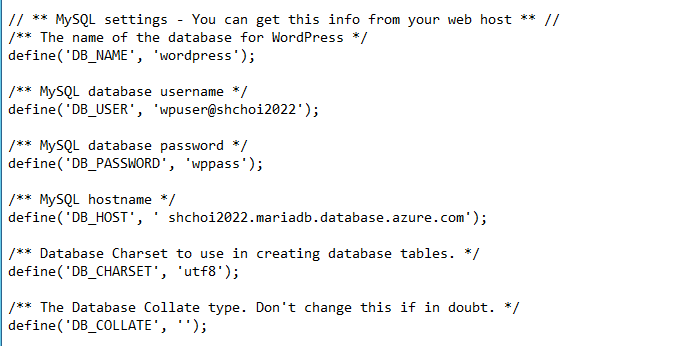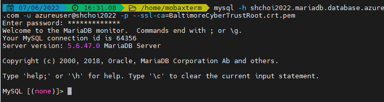 mysql -h shchoi2022.mariadb.database.azure.com -u azureuser@shchoi2022 -p --ssl-ca=BaltimoreCyberTrustRoot.crt.pem