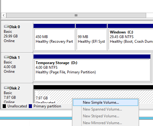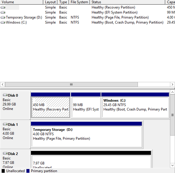 Unallocated 상태인 것을 확인할 수 있다.( 포멧, mount되지 않은 것)