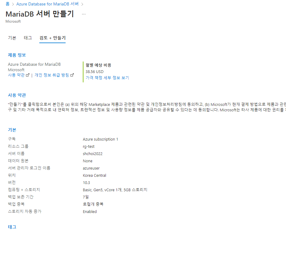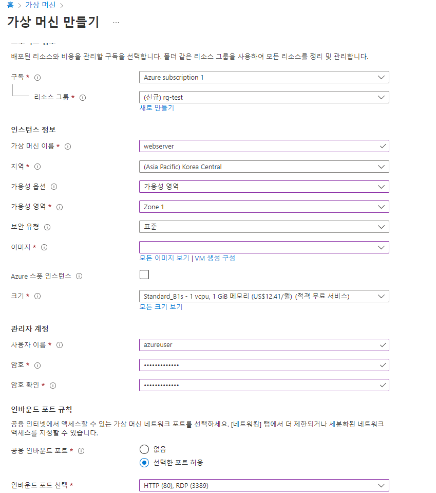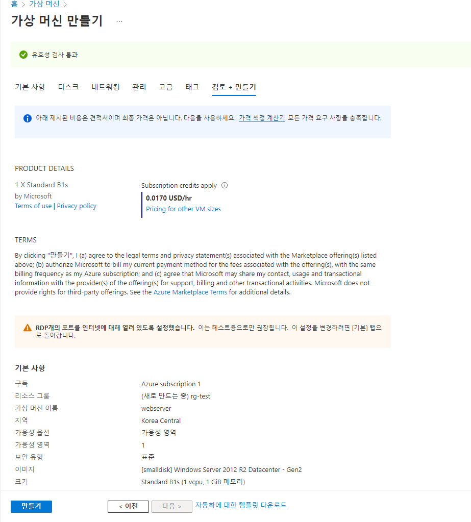 리소스 그룹 - 'rg-test' 이름으로 새로 만든다.