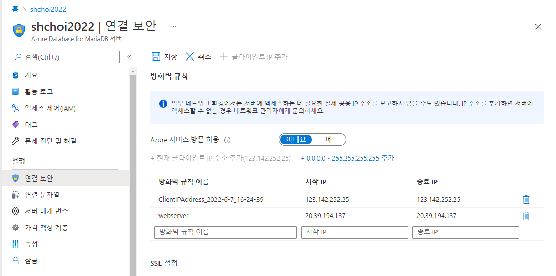 하지만 azure에서는 [클라이언트 IP 추가] 를 통해 하나의 IP를 세팅할 수 있다.