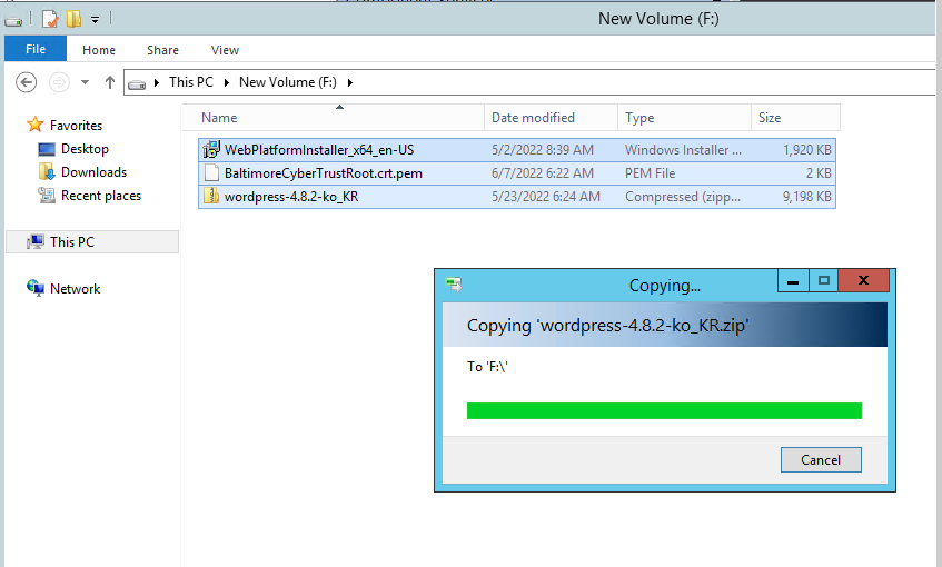 Baltimore, wordpress.zip, WebplatformInstaller를 F디스크에 복사 - 붙여넣기 한다.