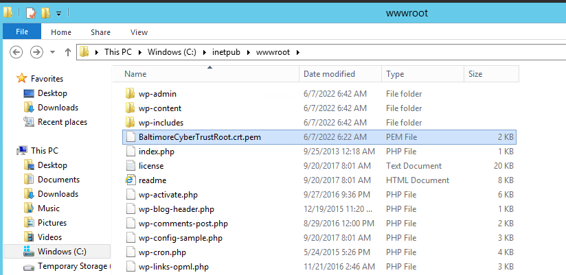 BaltimoreCyterTrustRoot.crt.pem 파일을 복사 - wwwroot에 붙여넣기 한다.