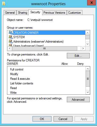 Users(webserver\Users)와 IIS_IUSRS(webserver\IIS_IUSRS)의 Permissions를 Allow로 수정한 뒤 - Apply를 누르고 - OK버튼을 누른다.