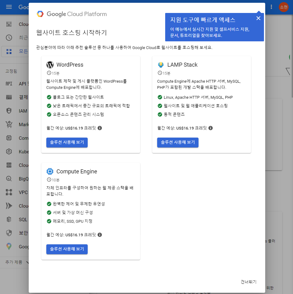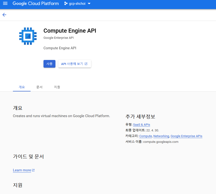 사이드바에서 [Compute Engine] 클릭, [사용]을 클릭한다.