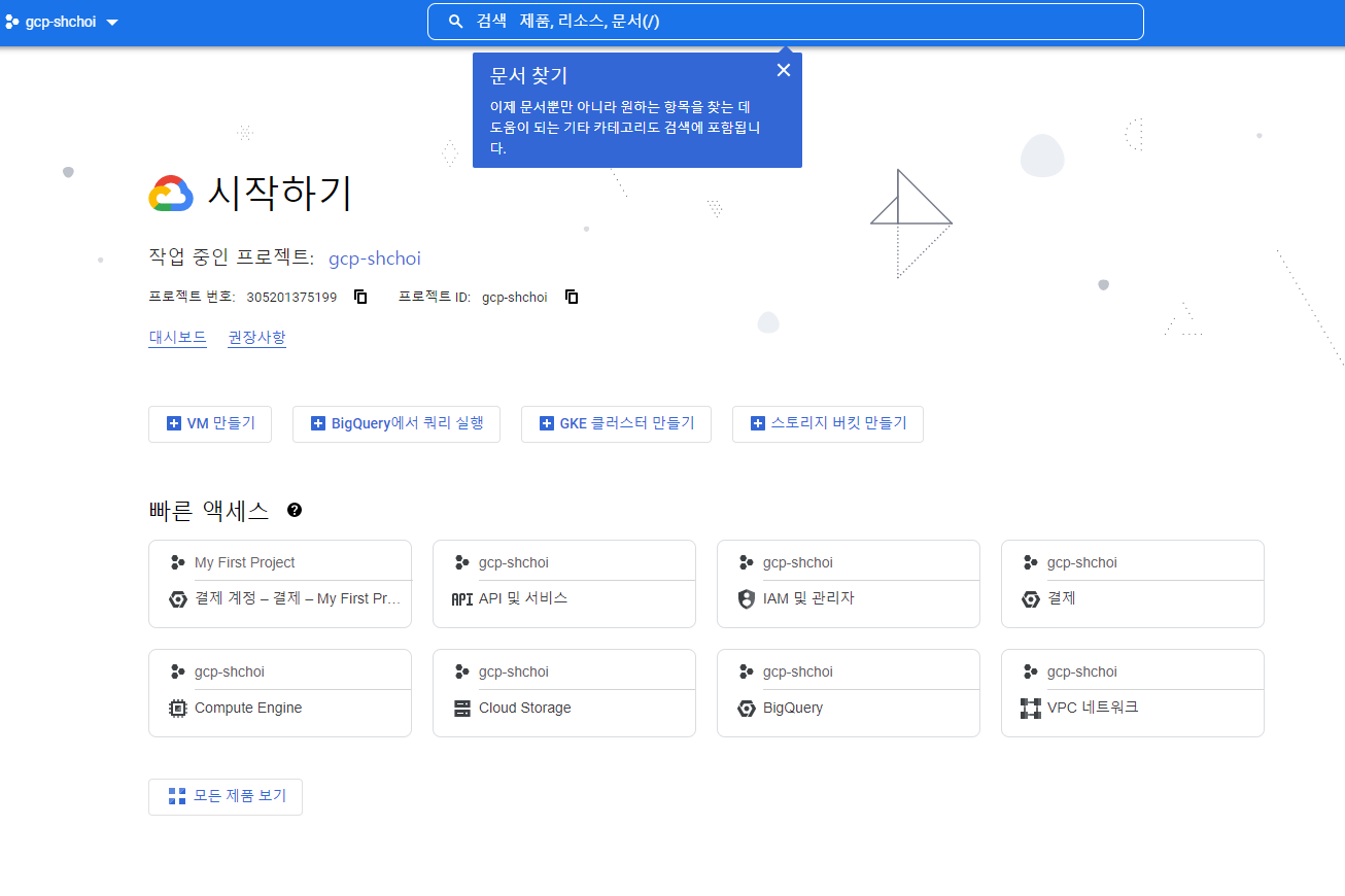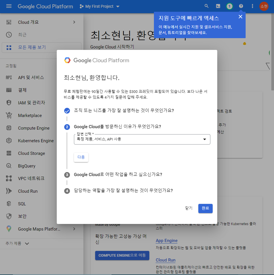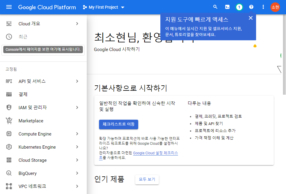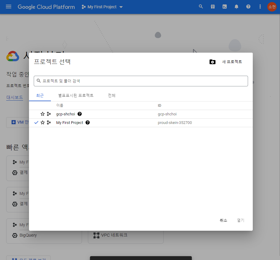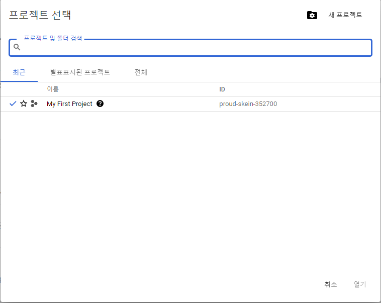 그리고 상단의 [프로젝트 선택] 을 클릭하면, 아까 생성했던 프로젝트가 나타나는 것을 볼 수 있다.