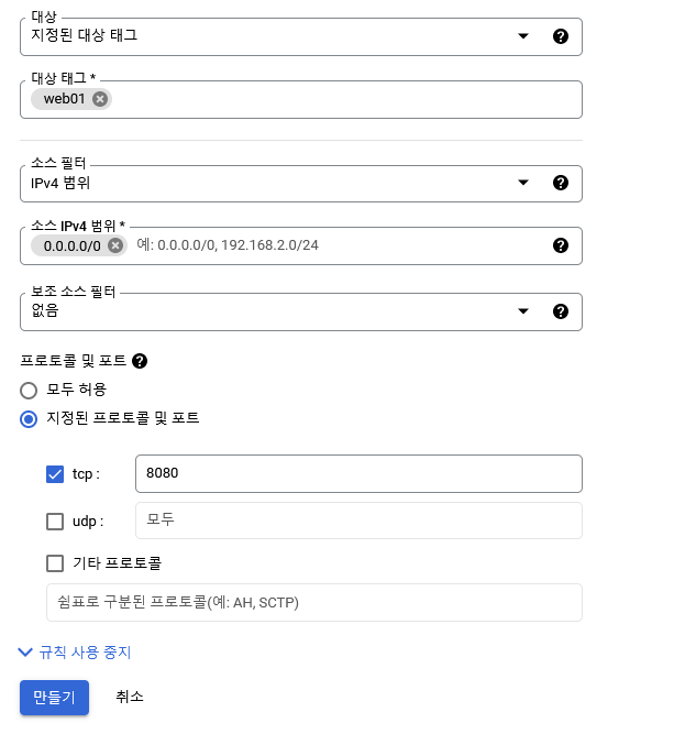 대상 - [지정된 대상 태그]를 선택한 뒤, 대상 태그 - web01로 한다.(* web01 인스턴스를 지칭하는 게 아님)