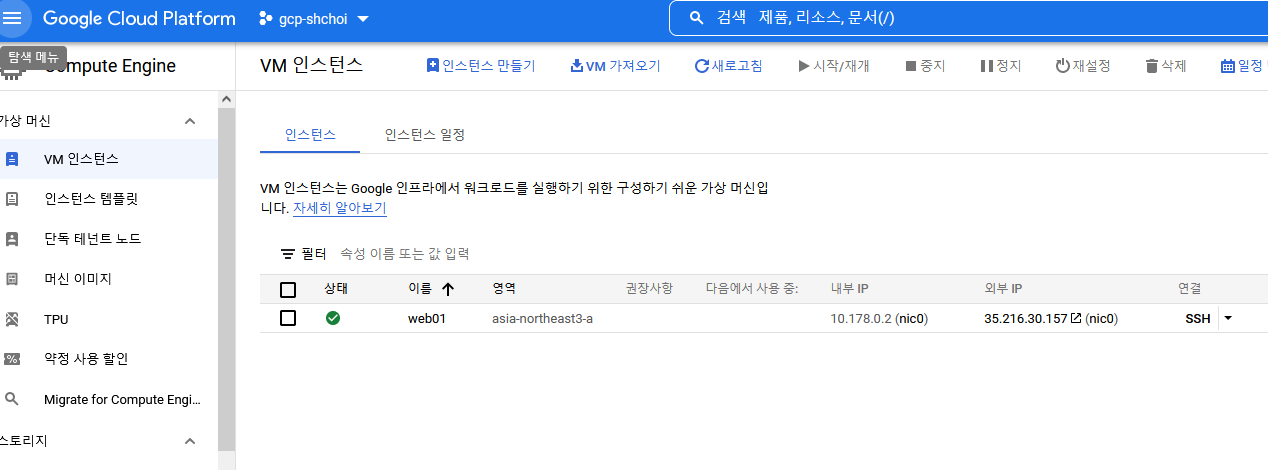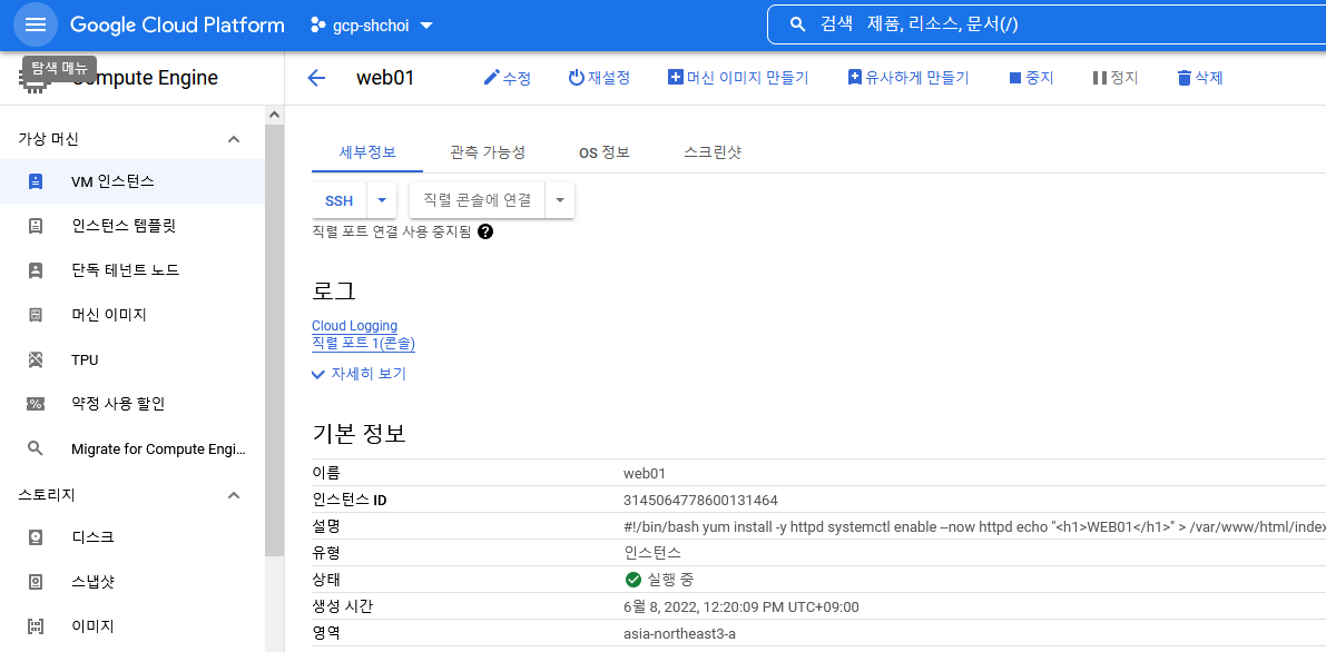 VM 인스턴스에 들어가서 web01을 클릭한다.