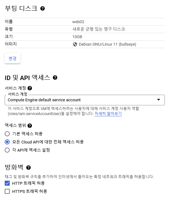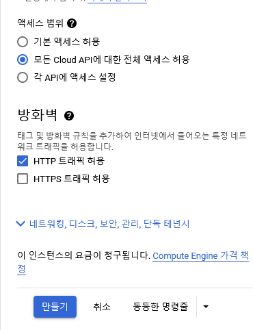 ssh, web server로서 80포트 오픈, 내가 접속하는 게 가능하기 위해서 [모든 Cloud API에 대한 전체 액세스 허용]으로 바꿔야 한다.