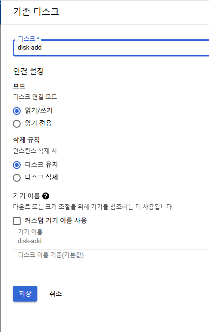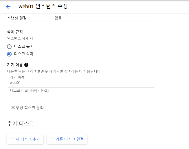 상단에 [수정]을 클릭한 뒤, [기존 디스크 연결]을 클릭한다.