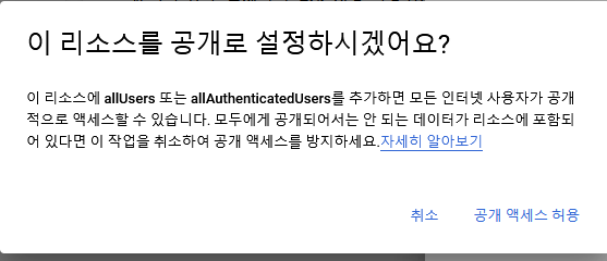 특정 사용자를 입력해서 특정 사용자만 접속할 수 있게 할 수도 있지만, 'allUsers'를 입력하면 모든 사용자가 접근 가능하게 된다.