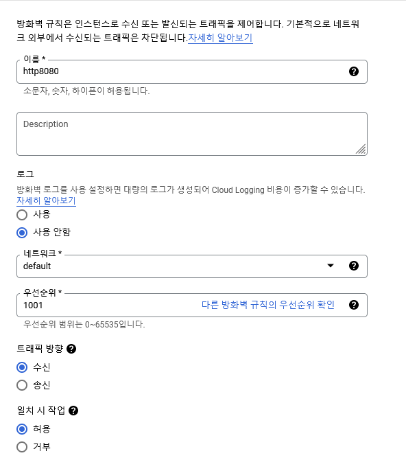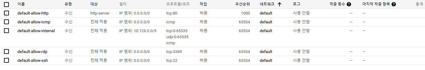 *** 참고) firewall이 눈에 보이는 것은 active상태이지만, 실제로는 아무것도 하고 있지 않는다.(이전의 AWS, Azure와 달리 firewall이 미리 설치되어있다)