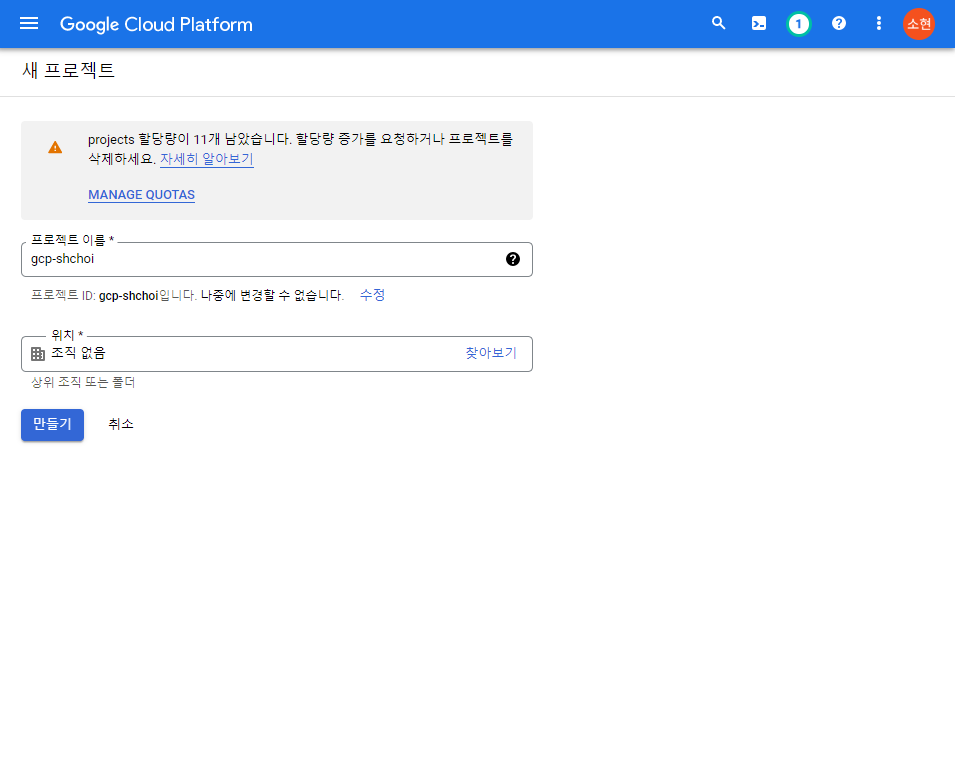 프로젝트 이름을 지정하고 [만들기] 버튼을 누른다.