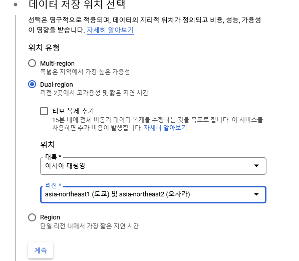 Multi-region(=multi-region) : 여러 지역에 데이터를 저장하기 때문에 안정적이다. 성능이 상승하지만 그만큼 비용도 상승하게 된다.