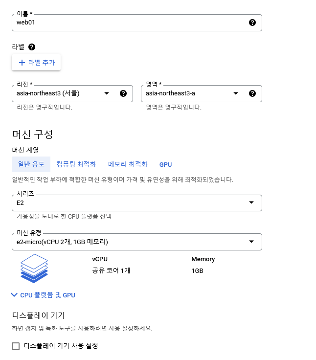 머신 유형 - e2-micro(vCPU의 최소 개수가 2개이기 때문에 더 줄일 수 없음)