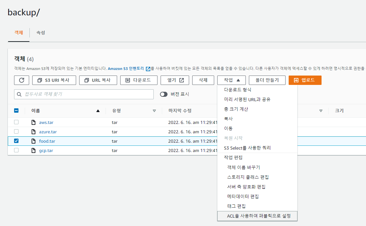 그 전에, S3로 돌아가서 food.tar 파일의 접근 권한을 변경한다.