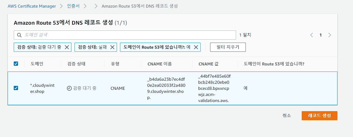 이 정보를 검증할 수 있도록 Route53에 레코드를 생성한다.