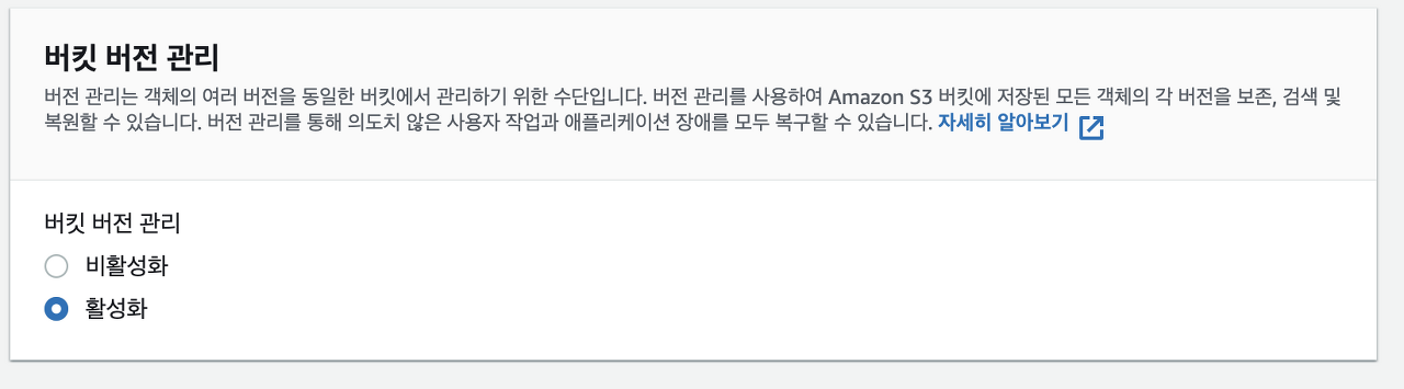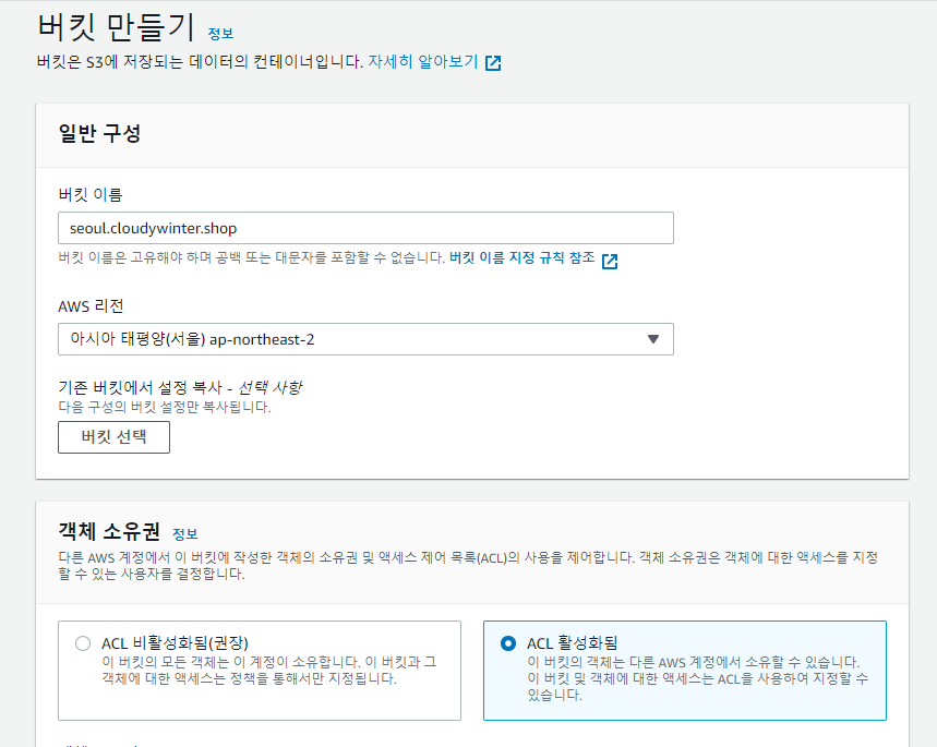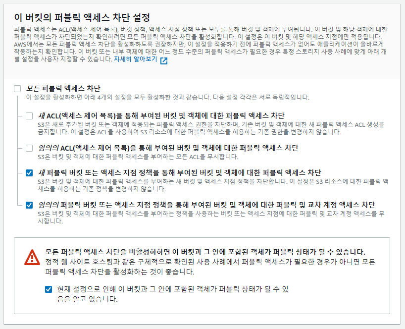 - ACL 활성화됨 - ACL의 정책을 내가 조정할 수 있음 -> 이걸 선택해야 하단의 [이 버킷의 퍼블릭 액세스 차단 설정]을 선택할 수 있다.