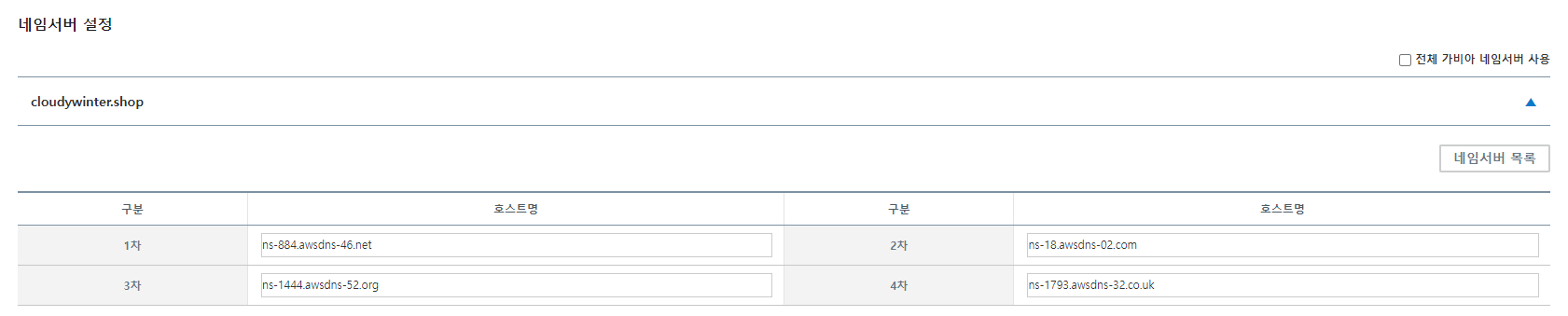 이를 가비아 사이트의 [네임 서버 설정] 에 붙여 넣는다.