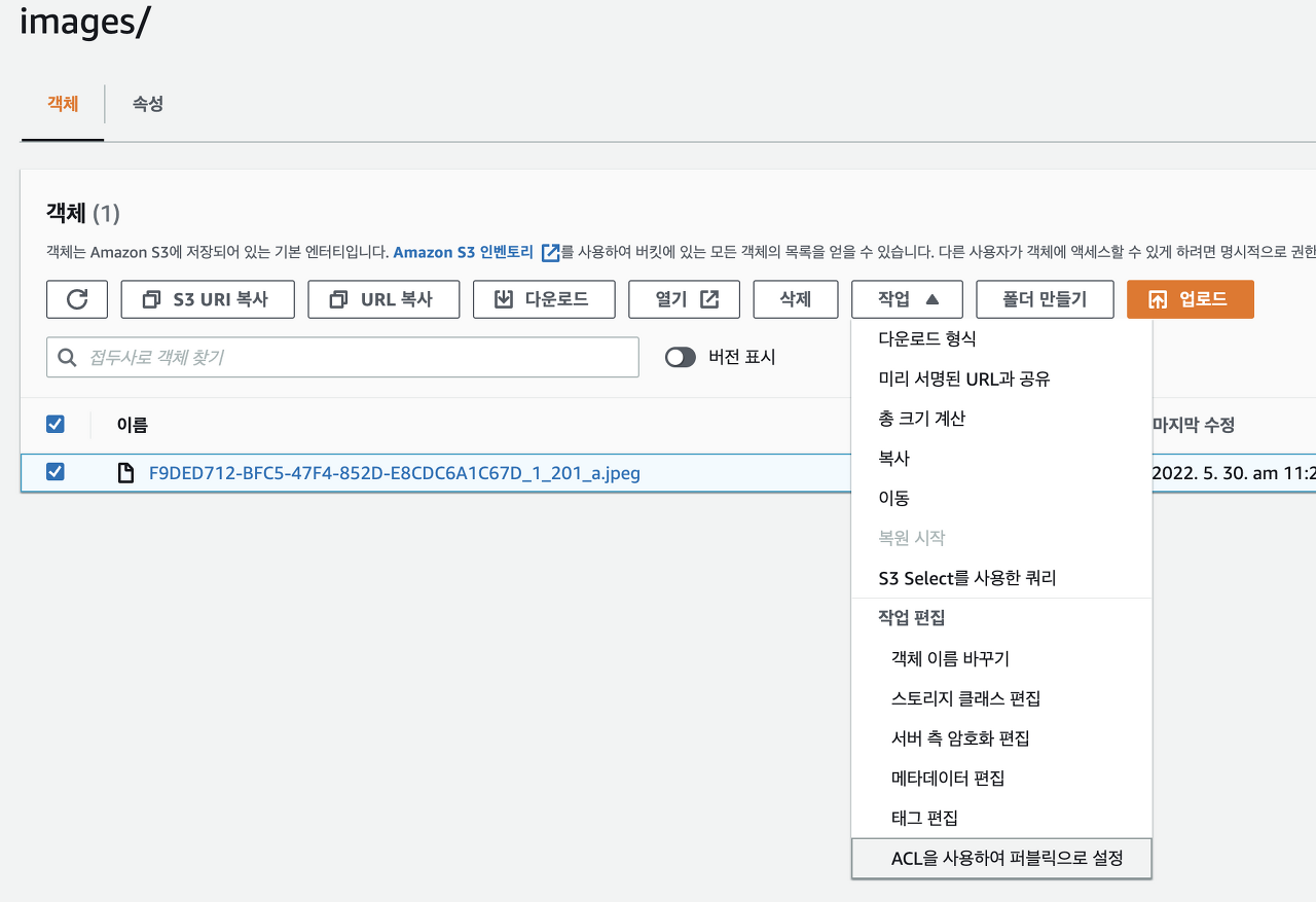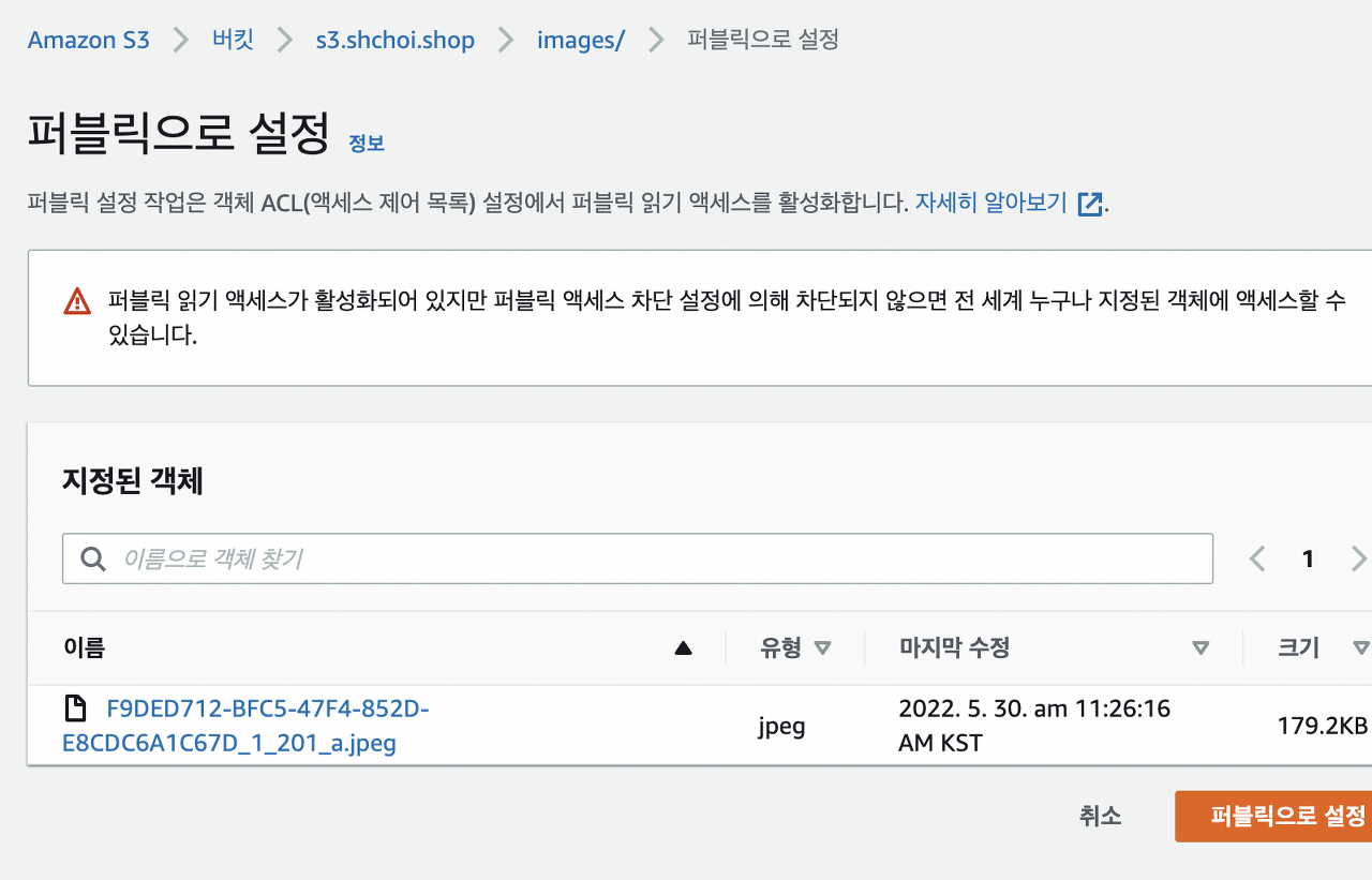 그러면 업로드 하는 과정에서 퍼블릭 엑세스가 생기게 된다.