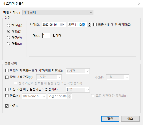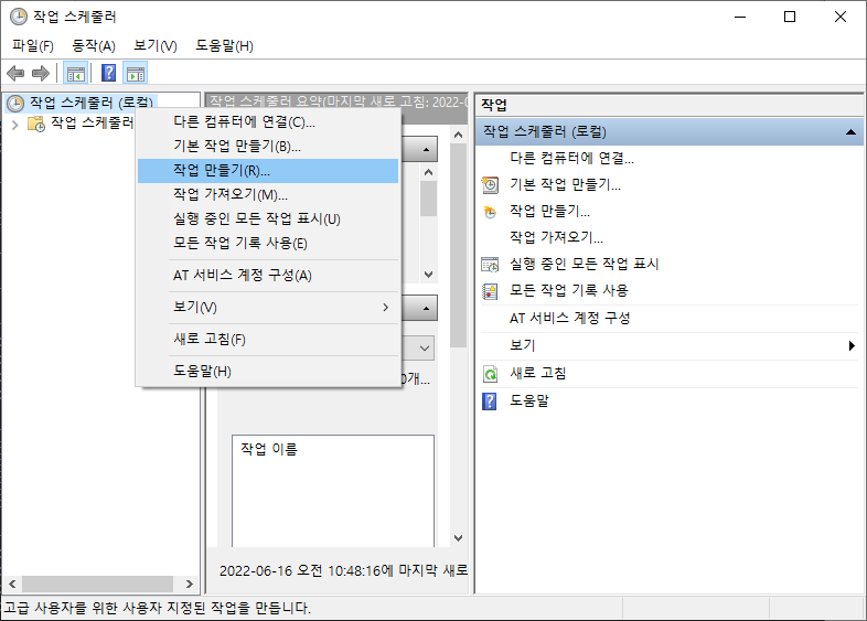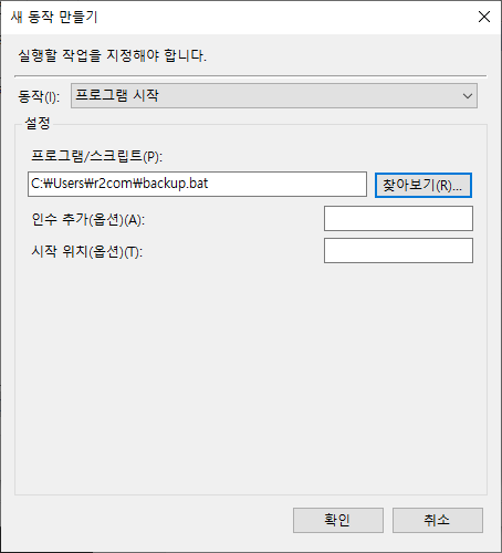 윈도우의 스케쥴러에서 등록시켜, 이 배치파일이 특정 시간에 실행될 수 있도록 한다.