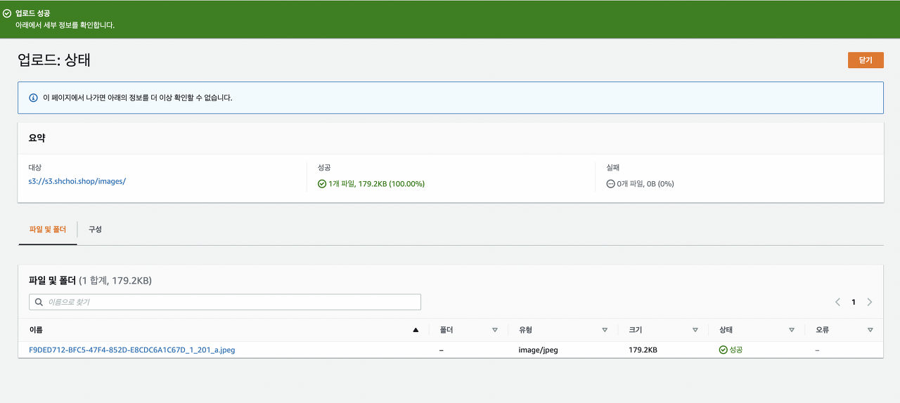 제일 밑에 [지정된 객체에 퍼블릭 읽기 액세스 권한을 부여할 위험이 있음을 알고 있습니다] 체크박스를 체크 해야 완료된다.