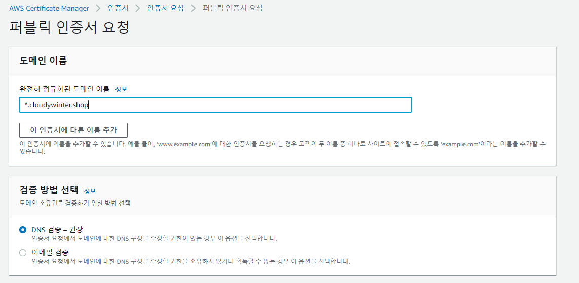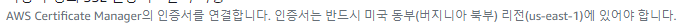 CloudFront 배포에 사용하기 위해서는 서울이 아닌, 버지니아 북부를 리전으로 지정한 뒤 인증서를 만들어야 한다.